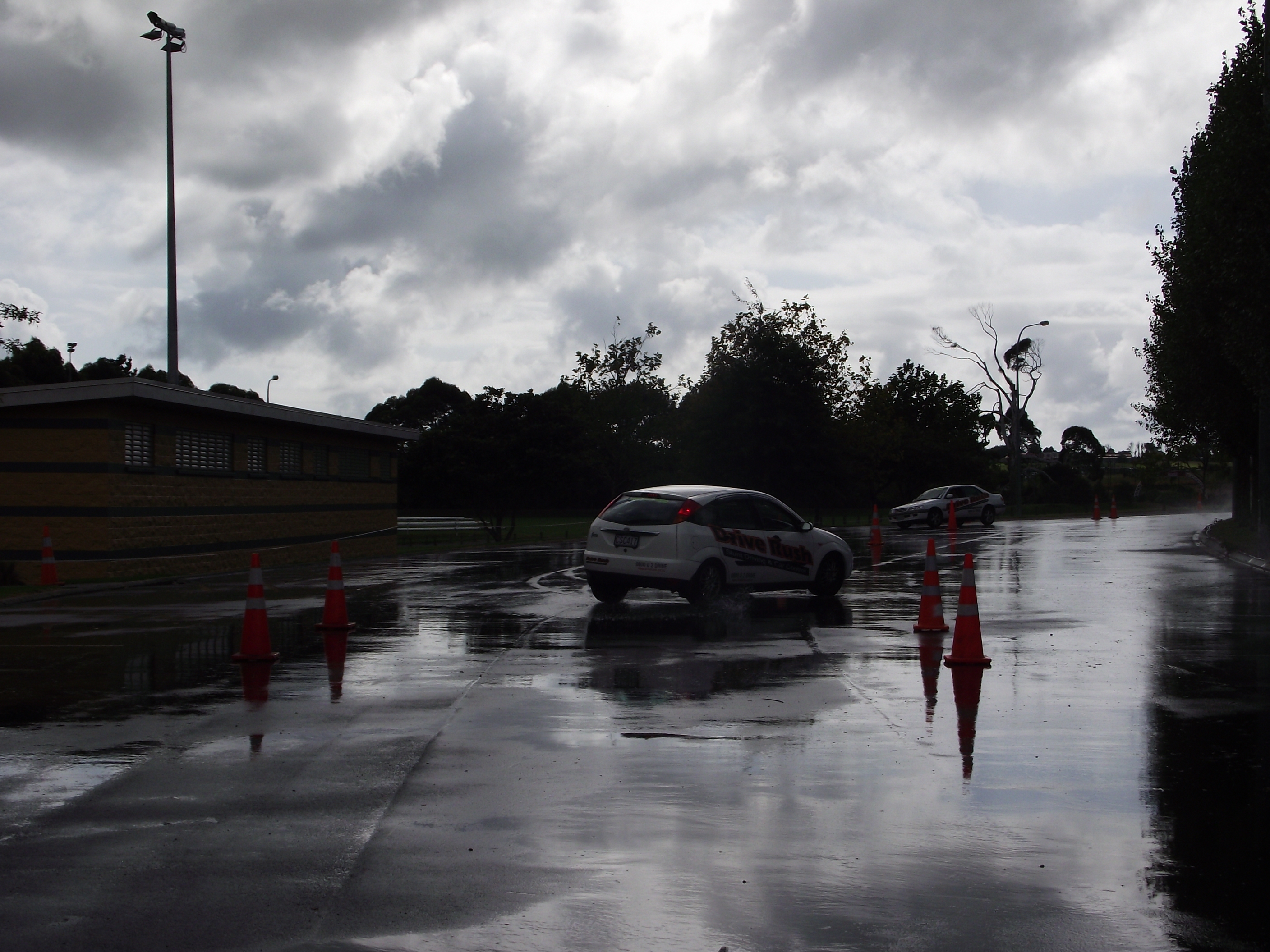 Next we headed back to the skid pan for a race. One instructor’s team against the other. One member of the team would head down the skidpan, do a 90 degree park, head back and do another with penalties given for various offences like killing an instructor, or a road cone. The next member would then do the same but with the 180 degree park and so-on. Well as I had found I was better at the 180 I opted to go second. The first run to the end and do the 180 was a bit slow as I was trying to remember how it was all done but with Peter sitting next to me filling my ears with the technique I pulled off a perfect 180 degree stop with no penalty. Brimming with more confidence and knowledge I headed back for the final 180 but that confidence was short lived when I realised the speed of the car was a little more than it should have been. The moment I pulled the handbrake I just knew that road cone wasn’t going to survive. Whoops, 10 second penalty, the only one our team got! Can’t remember the exact time but we were around 4 minutes 50 while the other team’s penalties saw them at closer to 5 minutes.