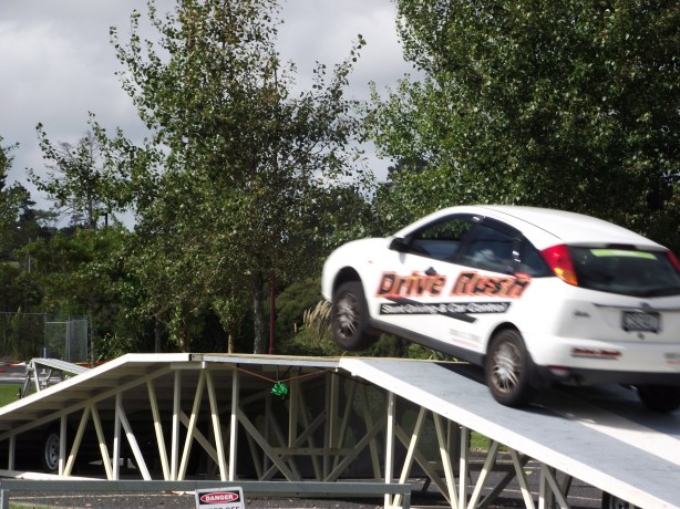 Then it was off to another area of the stadium car park where we laid our eyes on a ramp. Yes, a ramp. We were going to be jumping the cars. At first I must admit I was fair shitting myself here. All the videos of stunts gone wrong that I’ve seen on TV and YouTube over the years started flashing through my head but then I told myself ‘Don’t be stupid, these guys know what they are doing… I hope!’ After all, they will be in the car with us, are they brave or stupid? Well, my first run was up and not knowing what to expect I was a little apprehensive and didn’t accelerate quick enough initially but by the time we got to the ramp the speed was just right. The car launched into the air and came down with a bang on the ramp on the other side perfectly. The second run was much more enjoyable knowing what to expect. Thankfully Drive Rush have equipped their cars with limiters on them otherwise you’d be doing a quick shopping trip into The Warehouse at the other side of the car park!