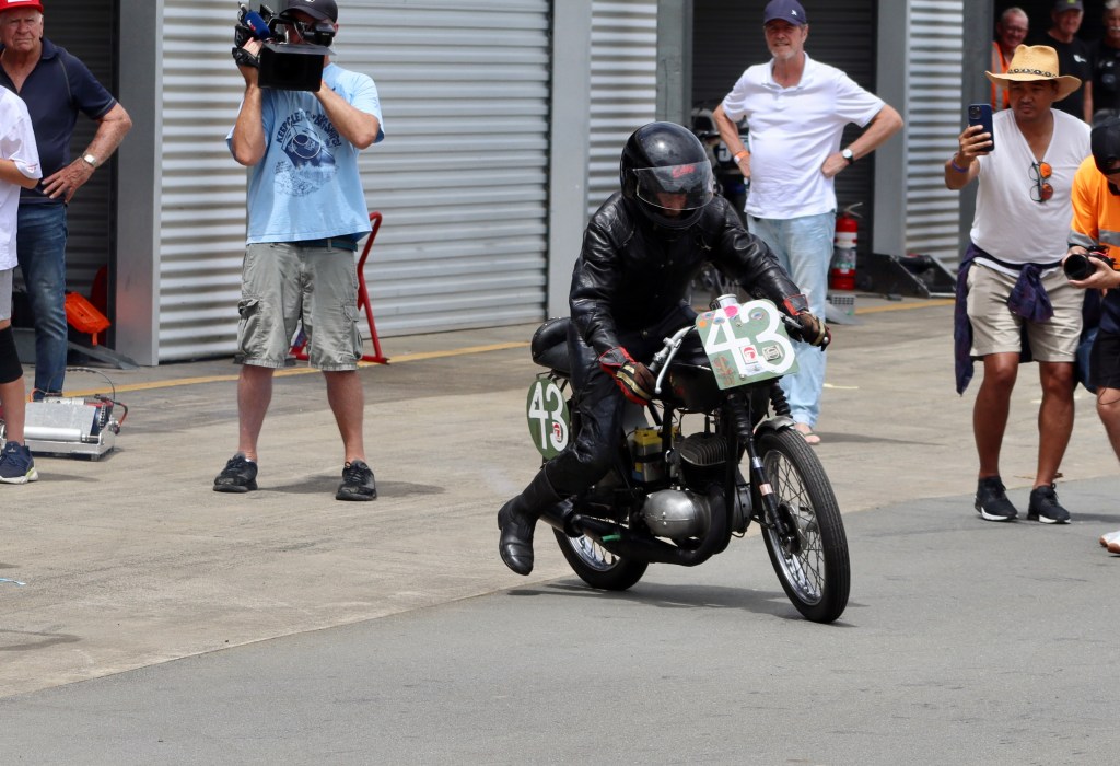 There were many BSA motorbikes entered including Les’ black 1960 BSA Bantam 175. As if it wasn’t enough that Les himself was racing this bike at 97 years young, also on track was his son, Rod Harris at a young 65 years old on a borrowed highly tuned BSA Bantam 175. But the icing on the cake was Olivia Harris, Les’ granddaughter, at 21 years old riding Les’ hill climb bike, a 1950 BSA Bantam 175. This was her very first time on track. Three generations all on track at the same time. An exceptionally special time for the Harris family, and it showed through in the emotion from all involved over the weekend.